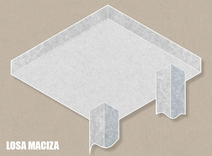 La losa maciza es totalmente hecha en el lugar de la obra. Su espesor va desde los 7 hasta los 15 cm aproximadamente. Su proceso consiste en la utilización de cimbra como molde; en la mayoría de los casos de madera, donde se colocará una armadura metálica y se verterá el concreto de acuerdo con el cálculo estructural realizado previamente.